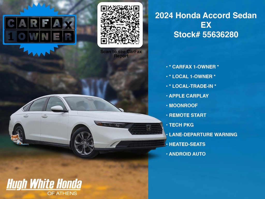 CARFAX VERIFIED 1-OWNER. Free CARFAX report! DESIRABLE FEATURES: * CARFAX 1-OWNER *, * LOCAL-TRADE-IN *, * LOCAL 1-OWNER *, APPLE CARPLAY, MOONROOF, HEATED-SEATS, ANDROID AUTO, REMOTE START, LANE-DEPARTURE WARNING, TECH PKG, KEYLESS-START, TURBO, BACKUP CAMERA, BLIND-SPOT MONITORING, BLUETOOTH, MULTI-ZONE AC, WiFi Hotspot, Remote entry. Your 2024 Honda Accord Sedan EX is perfect for daily work or weekend road trips to our neighboring communities of Athens.