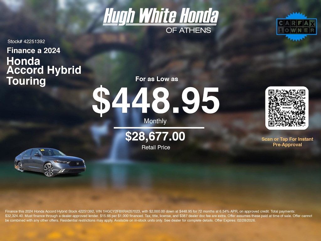 If you're ready to finance a quality used vehicle near Athens, Nelsonville, Logan, and Parkersburg, Hugh White Honda of Athens is thrilled to offer you a competitive finance offer on this 2024 Honda Accord Hybrid Touring. Use our car payment calculator to estimate your monthly payments or see how the monthly payment of $448.95 is calculated for well-qualified buyers shopping at Hugh White Honda of Athens with Tier 1 credit: