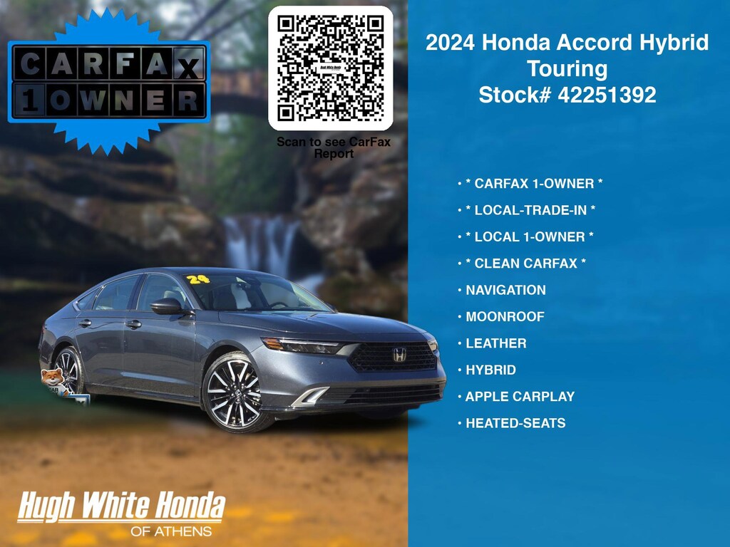 CARFAX VERIFIED 1-OWNER. Free CARFAX report! DESIRABLE FEATURES: * CARFAX 1-OWNER *, * LOCAL-TRADE-IN *, * LOCAL 1-OWNER *, NAVIGATION, CLEAN CARFAX, HYBRID, LEATHER, APPLE CARPLAY, MOONROOF, LANE-DEPARTURE WARNING, ANDROID AUTO, HEADS-UP DISPLAY, HEATED-SEATS, REMOTE START, COOLED SEATS, HEATED-REAR SEATS, TECH PKG, PREMIUM AUDIO, KEYLESS-START, BLIND-SPOT MONITORING, BACKUP CAMERA, WIRELESS PHONE CHARGING, BLUETOOTH, ALLOY-WHEELS, BACKUP-SENSORS, MULTI-ZONE AC, WiFi Hotspot, Remote entry. Your 2024 Honda Accord Hybrid Touring is perfect for daily work or weekend road trips to our neighboring communities of Athens.