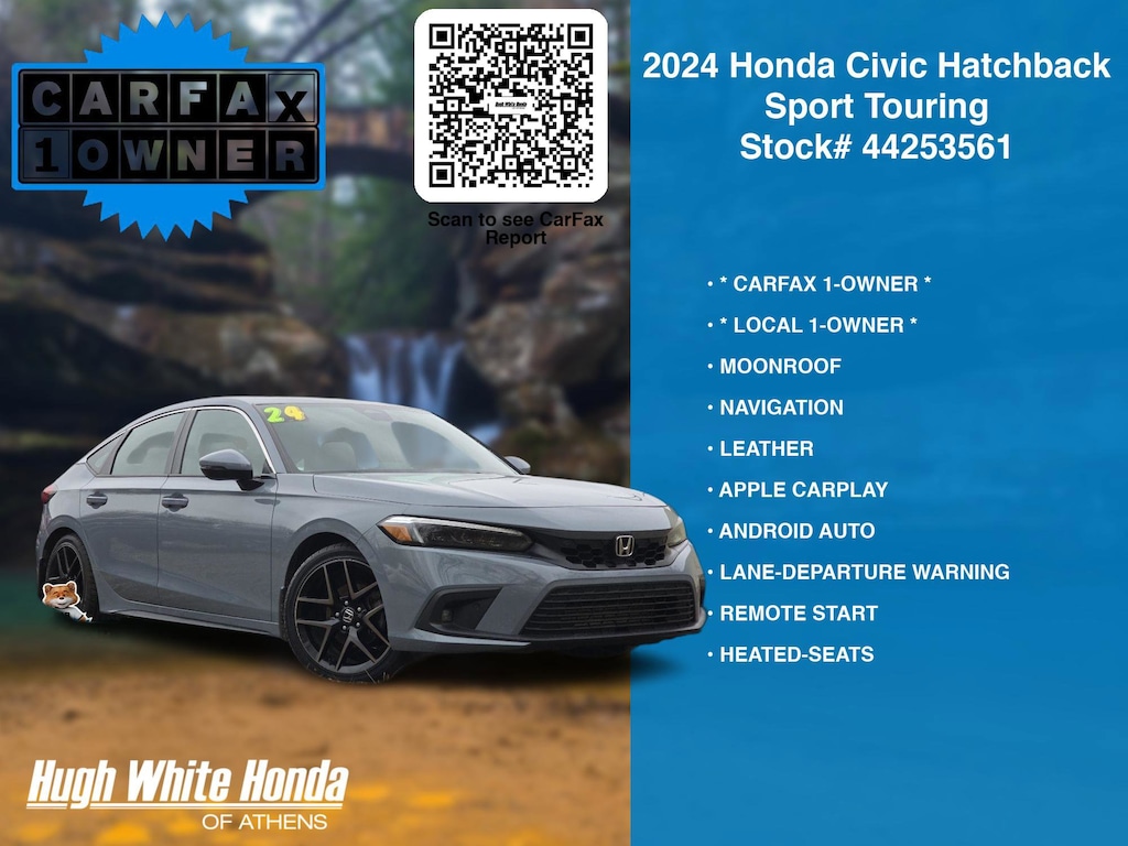 CARFAX VERIFIED 1-OWNER. Free CARFAX report! DESIRABLE FEATURES: * LOCAL 1-OWNER *, * CARFAX 1-OWNER *, APPLE CARPLAY, LEATHER, MOONROOF, NAVIGATION, TECH PKG, REMOTE START, LANE-DEPARTURE WARNING, ANDROID AUTO, HEATED-SEATS, TURBO, KEYLESS-START, PREMIUM AUDIO, BLIND-SPOT MONITORING, BLUETOOTH, WIRELESS PHONE CHARGING, BACKUP CAMERA, BACKUP-SENSORS, MULTI-ZONE AC, FOG LAMPS, SiriusXM, Remote entry. Your 2024 Honda Civic Hatchback Sport Touring is perfect for daily work or weekend road trips to our neighboring communities of Athens.