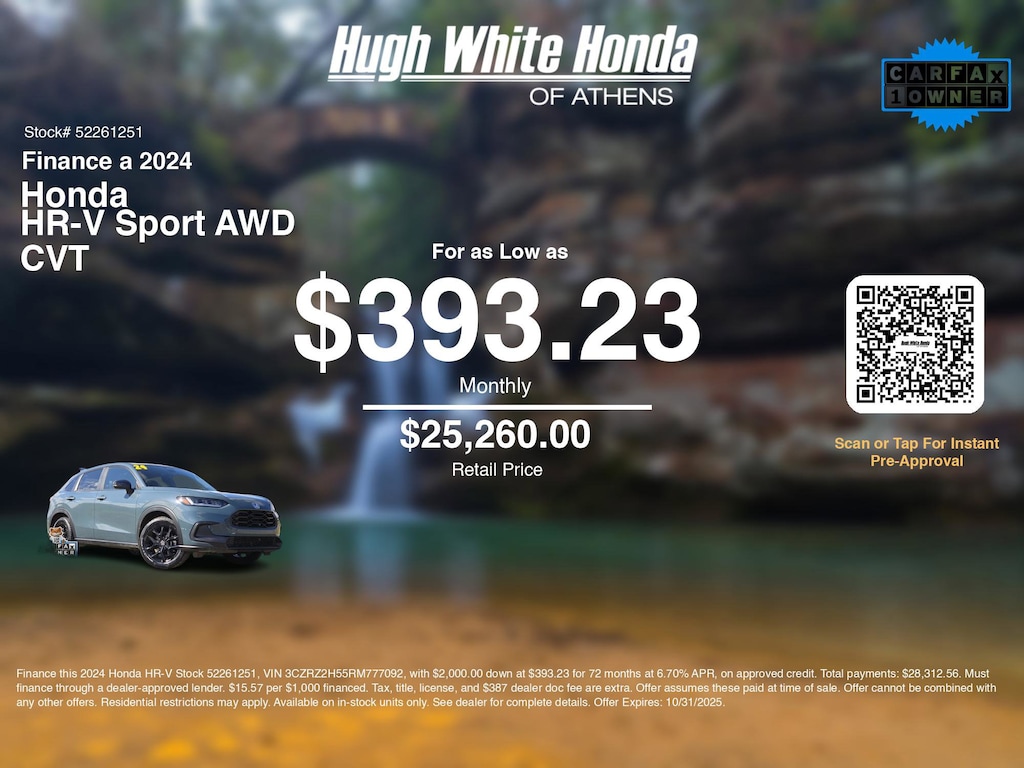 Our car loan payment calculator can help you calculate car payment options for this and other Honda finance offers that leverage the benefits of Honda Financial Services.@@ Call or drive in for Honda finance deals like this stunning 2024 Honda HR-V with finance options near Athens!  Use our car monthly payment calculator to estimate your car payment, or try our car payment estimator to explore different loan terms. These Honda finance specials end 10/31/2025.