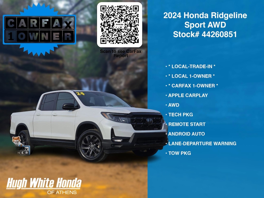 CARFAX VERIFIED 1-OWNER. Free CARFAX report! DESIRABLE FEATURES: * CARFAX 1-OWNER *, * LOCAL 1-OWNER *, * LOCAL-TRADE-IN *, AWD, APPLE CARPLAY, REMOTE START, TECH PKG, LANE-DEPARTURE WARNING, ANDROID AUTO, KEYLESS-START, TOW PKG, BACKUP CAMERA, BLUETOOTH, BED LINER, WIRELESS PHONE CHARGING, BLIND-SPOT MONITORING, MULTI-ZONE AC, FOG LAMPS, Remote entry. Your 2024 Honda Ridgeline Sport AWD is perfect for daily work or weekend road trips to our neighboring communities of Athens.
