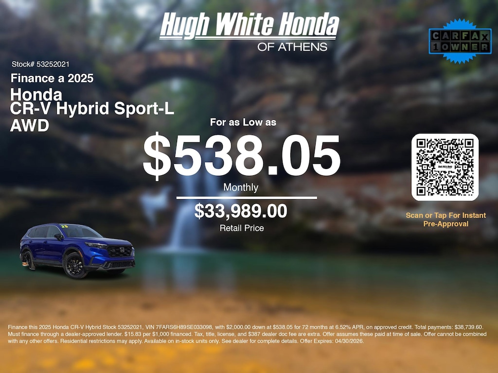 If you're ready to finance a quality used vehicle near Athens, Nelsonville, Logan, and Parkersburg, Hugh White Honda of Athens is thrilled to offer you a competitive finance offer on this 2025 Honda CR-V Hybrid Sport-L AWD. Use our car payment calculator to estimate your monthly payments or see how the monthly payment of $538.05 is calculated for well-qualified buyers shopping at Hugh White Honda of Athens with Tier 1 credit:
