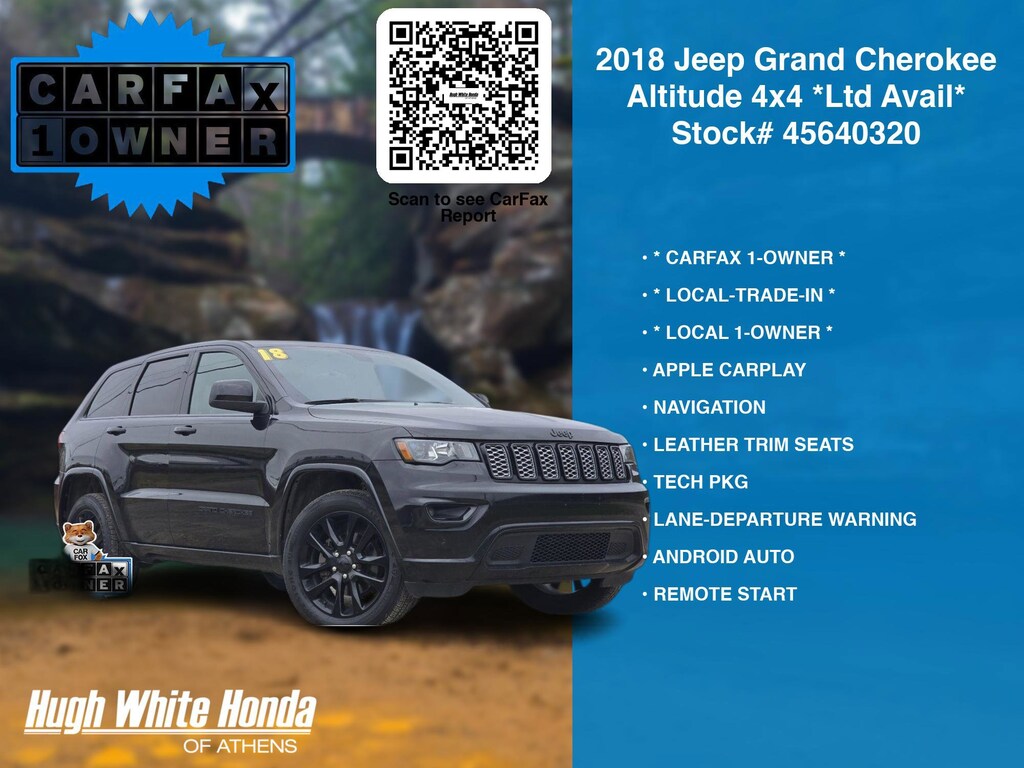 CARFAX VERIFIED 1-OWNER. Free CARFAX report! DESIRABLE FEATURES: * LOCAL-TRADE-IN *, * LOCAL 1-OWNER *, * CARFAX 1-OWNER *, APPLE CARPLAY, LEATHER TRIM SEATS, NAVIGATION, 4X4, REMOTE START, HEATED-SEATS, ANDROID AUTO, TECH PKG, LANE-DEPARTURE WARNING, HEATED-STEERING WHEEL, KEYLESS-START, BLUETOOTH, BACKUP CAMERA, FOG LAMPS, BACKUP-SENSORS, MULTI-ZONE AC, SiriusXM, Remote entry. Your 2018 Jeep Grand Cherokee Altitude 4x4 *Ltd Avail* is perfect for daily work or weekend road trips to our neighboring communities of Athens.Hugh White Athens also offers extended vehicle service contracts so our Athens, OH area drivers enjoy a worry free used car, SUV or van ownership experience.