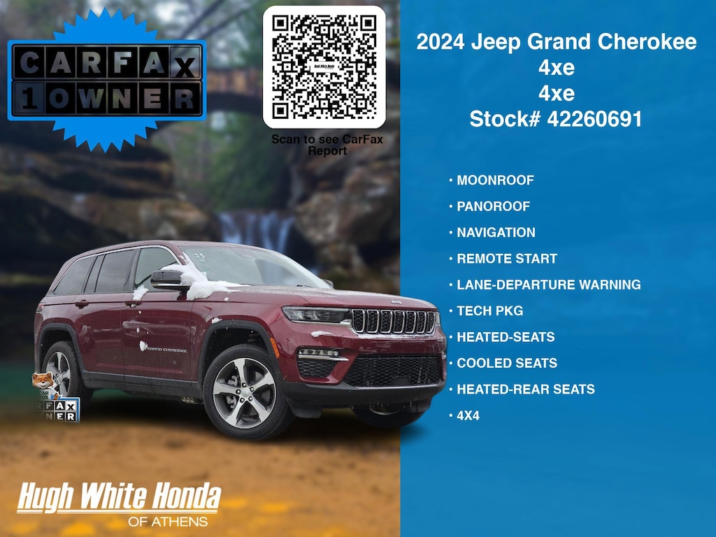 CARFAX VERIFIED 1-OWNER. Free CARFAX report! DESIRABLE FEATURES: MOONROOF, PANOROOF, NAVIGATION, LANE-DEPARTURE WARNING, HEATED-SEATS, REMOTE START, 4X4, COOLED SEATS, TECH PKG, HEATED-REAR SEATS, HEATED-STEERING WHEEL, PREMIUM AUDIO, KEYLESS-START, TURBO, BLUETOOTH, BACKUP CAMERA, POWER LIFT-GATE, HANDS-FREE LIFTGATE, BLIND-SPOT MONITORING, WIRELESS PHONE CHARGING, MULTI-ZONE AC, ALLOY-WHEELS, FOG LAMPS, WiFi Hotspot, Remote entry, SiriusXM. Your 2024 Jeep Grand Cherokee 4xe 4xe is perfect for daily work or weekend road trips to our neighboring communities of Athens.Hugh White Athens also offers extended vehicle service contracts so our Athens, OH area drivers enjoy a worry free used car, SUV or van ownership experience.