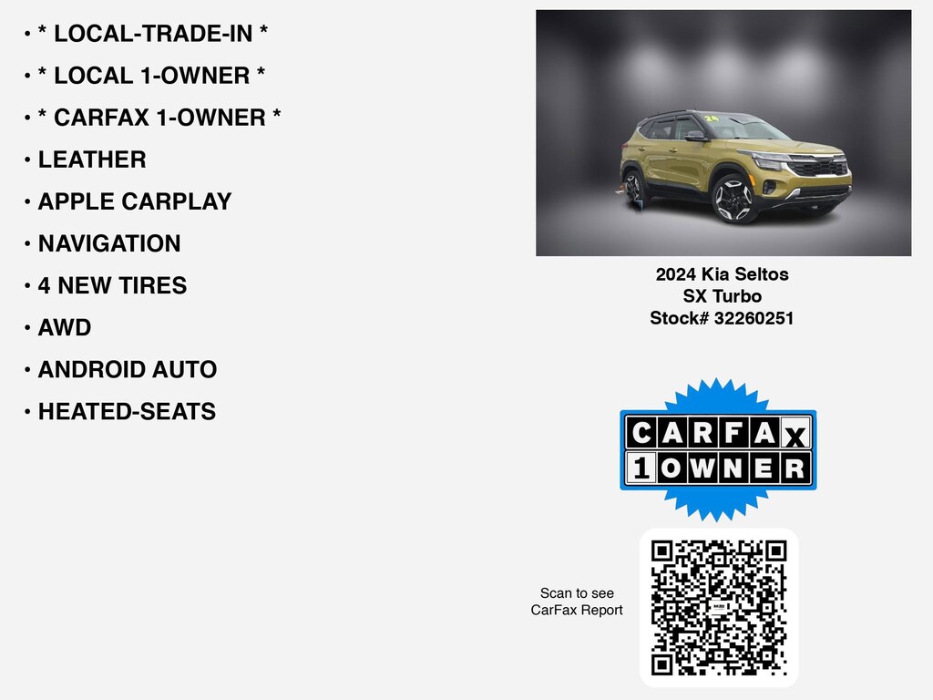 CARFAX VERIFIED 1-OWNER. Free CARFAX report! DESIRABLE FEATURES: * CARFAX 1-OWNER *, * LOCAL 1-OWNER *, * LOCAL-TRADE-IN *, LEATHER, 4 NEW TIRES, AWD, APPLE CARPLAY, NAVIGATION, ANDROID AUTO, HEATED-SEATS, LANE-DEPARTURE WARNING, BOSE AUDIO, BLIND-SPOT MONITORING, BLUETOOTH, BACKUP CAMERA, FOG LAMPS, ALLOY-WHEELS, Remote entry, SiriusXM. Your 2024 Kia Seltos SX Turbo is perfect for daily work or weekend road trips to our neighboring communities of Lancaster, Columbus, Newark, Pickerington, and Logan.Hugh White Chevrolet of Lancaster also offers extended vehicle service contracts so our Lancaster, OH area drivers enjoy a worry-free used car, SUV or van ownership experience. We proudly serve the counties of Fairfield, Hocking, Perry, Licking, and Pickaway with quality pre-owned vehicles Ohio drivers can trust.