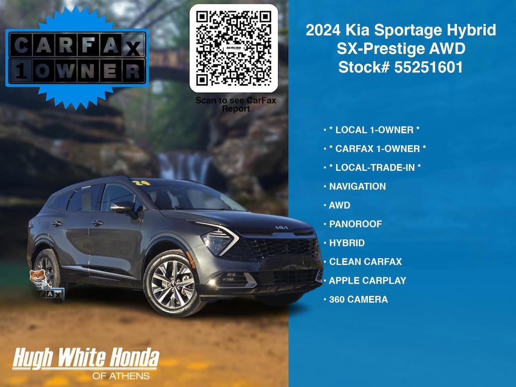 CARFAX VERIFIED 1-OWNER. Free CARFAX report! DESIRABLE FEATURES: * CARFAX 1-OWNER *, * LOCAL 1-OWNER *, * LOCAL-TRADE-IN *, PANOROOF, 360 CAMERA, NAVIGATION, AWD, APPLE CARPLAY, HYBRID, MOONROOF, LEATHER, CLEAN CARFAX, COOLED SEATS, TECH PKG, ANDROID AUTO, HEATED-SEATS, LANE-DEPARTURE WARNING, KEYLESS-START, TURBO, PREMIUM AUDIO, HEATED-STEERING WHEEL, BACKUP CAMERA, BLUETOOTH, POWER LIFT-GATE, BLIND-SPOT MONITORING, HANDS-FREE LIFTGATE, FOG LAMPS, BACKUP-SENSORS, MULTI-ZONE AC, Remote entry, SiriusXM. Your 2024 Kia Sportage Hybrid SX-Prestige AWD is perfect for daily work or weekend road trips to our neighboring communities of Athens.Hugh White Athens also offers extended vehicle service contracts so our Athens, OH area drivers enjoy a worry free used car, SUV or van ownership experience.