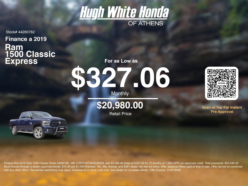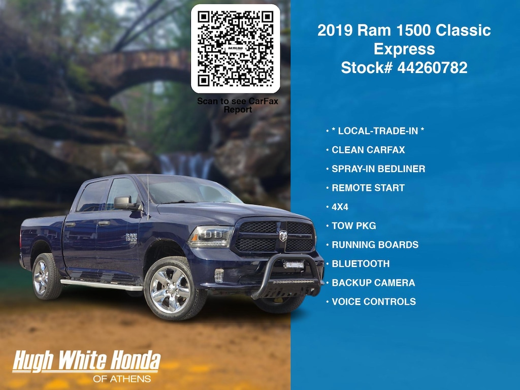 Our Car Dealership in Athens, OH: Call Hugh White Athens today at (844) 859-8630 TO SCHEDULE YOUR TEST DRIVE of this 2019 Ram 1500 Classic Express. You can also visit us at 250 Columbus Road. Athens, OH 45701 to check it out in person! Our Hugh White Athens Used car dealership only sells used cars Athens, OH buyers can trust for safety and worry free driving.